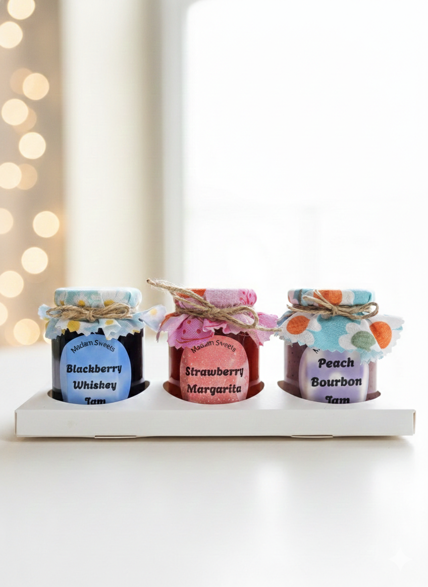 Why give a bottle when you can give a whole experience? Our Happy Hour Trio reimagines your favorite cocktail bar classics as luxurious, small-batch preserves. Handcrafted by Madam Sweets, this collection is designed for those who believe breakfast should be just as spirited as a Saturday night.